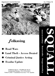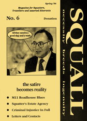 This focus no doubt sprung from the fact that SQUALL was produced by and for people whose ways of living happened to be directly targeted by this new legislation at the time: The strapline on early issues denotes its focus at this point - 'Magazine for squatters, travellers and assorted itinerants' - all key targets of sections of the CJA. Meanwhile SQUALL also wrote about the trials and tribulations of rural communities around the country - some squatted, some on owned land.