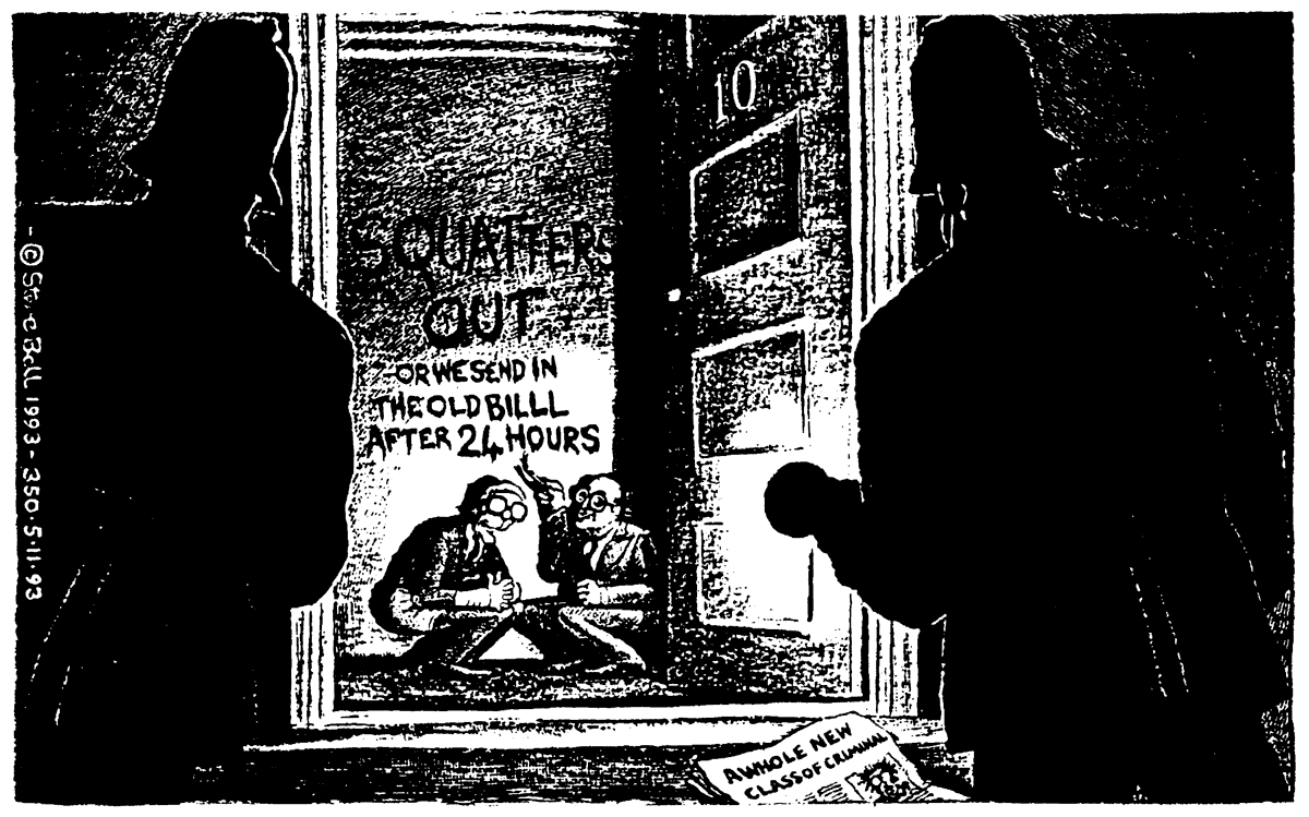 Squatters and travellers, although far from ignored in Michael Howard’s ‘27 scapegoats for crime’ speech, did not receive a mention until the following month with: “Time to Squash the Squatters: The Government is finally taking action against squatters, Rachel Kelly writes. But is it right to turn them into criminals?” (The Times 13/10/93). The article quoted Lou Crisfield, a SQUASH spokeswoman, who reminded everyone (again): “The numbers won’t go down; squatters do not have an alternative. The Government did not match its proposals with announcements of plans for new hostels and extra resources.”